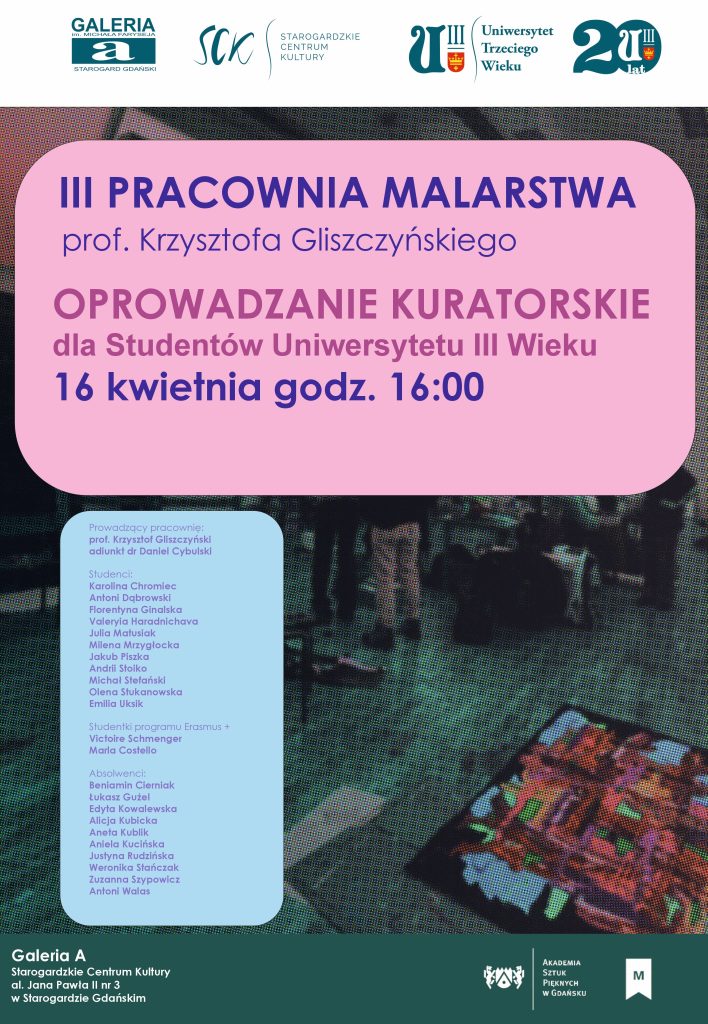 Zapraszamy Studentów Uniwersytetu Trzeciego Wieku na oprowadzanie kuratorskie po wystawie III Pracowni Malarstwa prof. Krzysztofa Gliszczyńskiego.