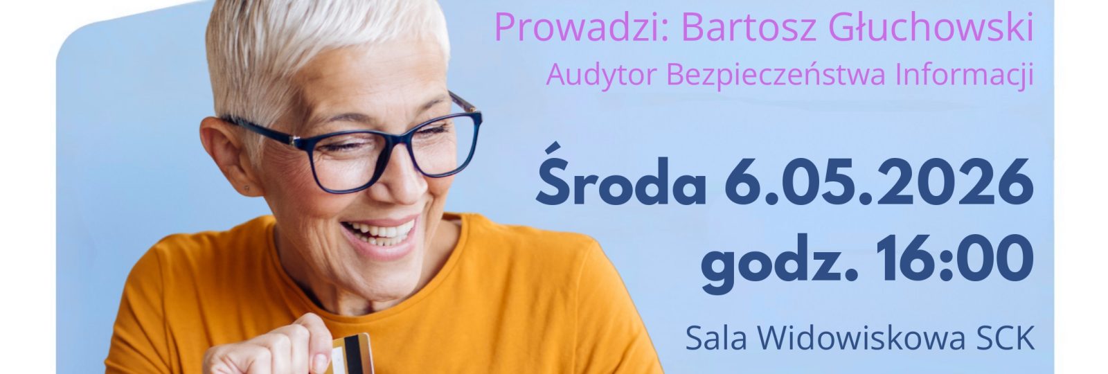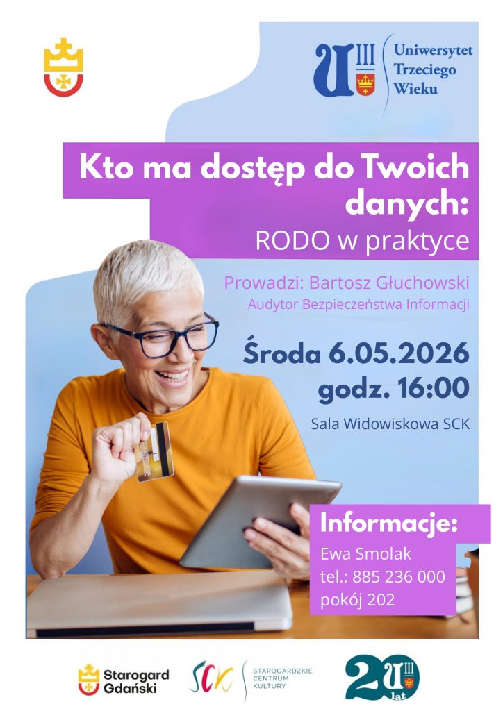 Zapraszamy na wykład pt. „Kto ma dostęp do Twoich danych? RODO w praktyce”, który odbędzie się w środę, 6 maja 2026 r. o godz. 16:00 w sali widowiskowej Starogardzkiego Centrum Kultury.